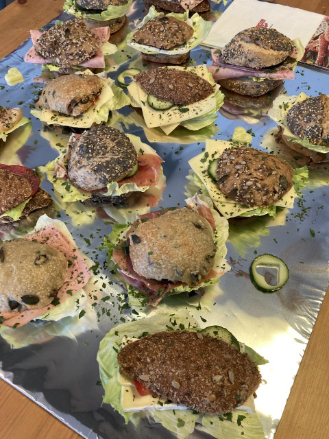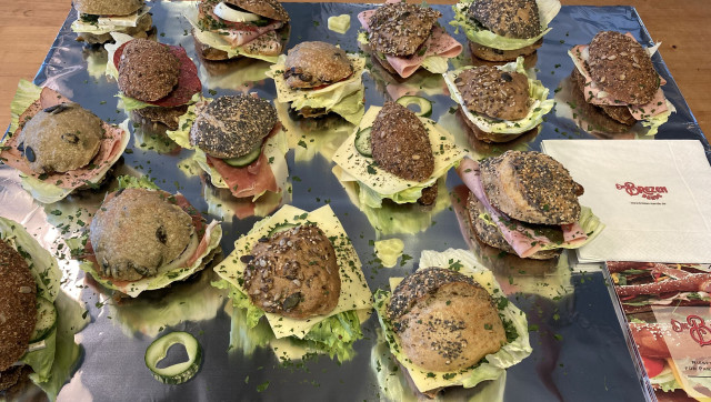 Unser Vollkorn Mix ist eine Zusammenstellung aus 16 Vollkorn Semmeln (Vollkorn, Kürbiskern, Nuss, Saaten) und sind belegt mit hausgemachtem Kräuterquark, einer Salatunterlage, verschiedenen Wurst- und Käsebelägen und garniert mit frischem Gemüse und Kräutern. Der Vollkorn MIx ist zur Hälfte vegetarisch belegt.