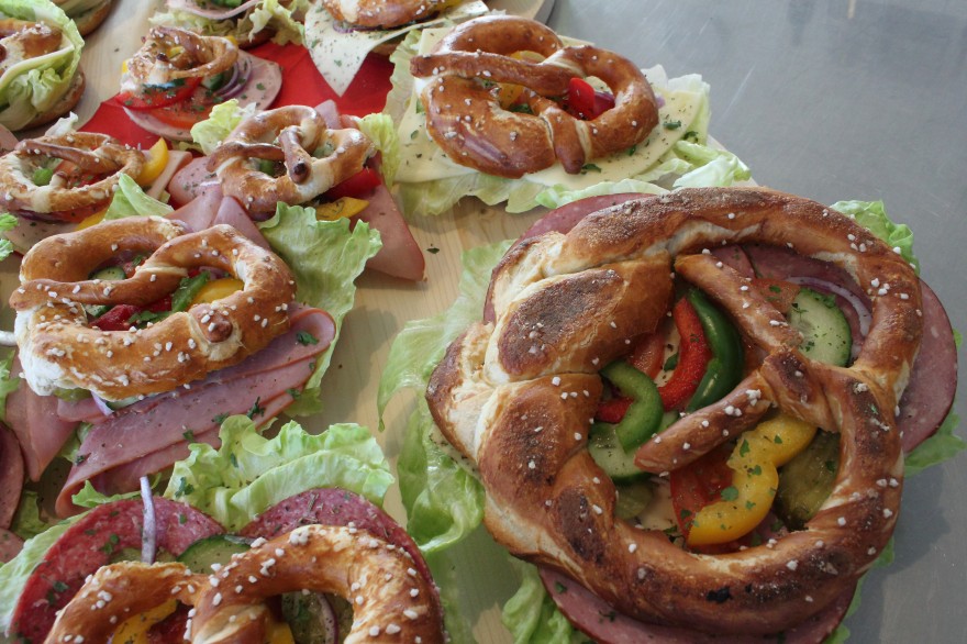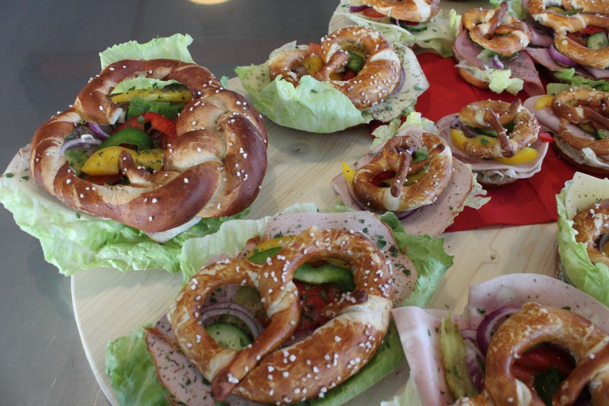 Unsere Brezen Familie ist eine Zusammenstellung aus verschiedenen Laugenbackwaren. Sie besteht aus 8 normalen Brezen "M", 5 kleinen Mini Brezen "S" und 5 Brezensemmeln. Die Brezen sind belegt mit hausgemachtem Kräuterquark, einer Salatunterlage, verschiedenen Wurst- und Käsebelägen und sind garniert mit frischem Gemüse und Kräutern. Auch die Brezen Familie ist zu 1/3 vegetarisch belegt.