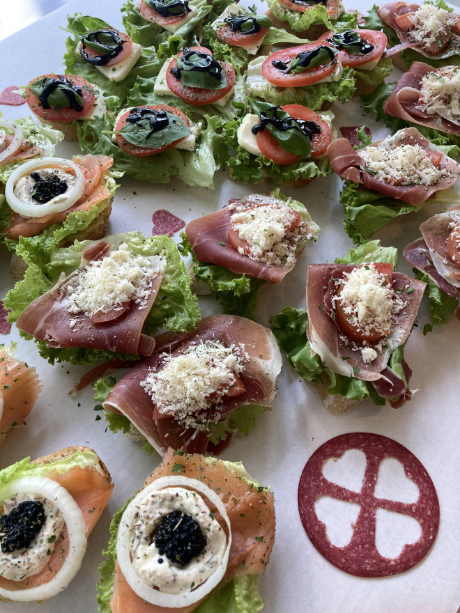 Auf festlicheren Anlässen dürfen Canapés nicht fehlen. Unsere leckeren Dinkel Baguette Stücke sind delikat belegt mit feinsten Belägen, z.B.: